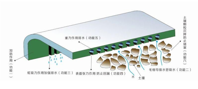 本產(chǎn)品采用PVC高密度聚合材料,具有較好的韌性,埋于土中可以起到拉結(jié)土壤的作用(功能一);且一反傳統(tǒng)改采用密集溝槽,內(nèi)大外小的設(shè)計(jì),且埋設(shè)時(shí)溝槽面向下,而使水流由下往上倒吸進(jìn)入毛細(xì)導(dǎo)水管(功能二);如此一來(lái)土壤顆粒因重力自然沉淀不致隨同水流進(jìn)入毛細(xì)導(dǎo)水管內(nèi),同時(shí)也不會(huì)在進(jìn)水槽溝附近產(chǎn)生淤積現(xiàn)象(功能三);但是內(nèi)部溝槽既能進(jìn)水,同時(shí)也造成漏水之后果,此時(shí)毛細(xì)防排水板則利用表面張力使水在溝槽上產(chǎn)生封閉效果不回漏(功能四);當(dāng)水進(jìn)入時(shí),毛細(xì)現(xiàn)象會(huì)自然而然對(duì)土壤中的水分產(chǎn)生抽吸的效果,直到灌滿并以重力流向外排放(功能五);當(dāng)水流到達(dá)出口將因落差產(chǎn)生虹吸作用,進(jìn)一步對(duì)土壤內(nèi)部產(chǎn)生負(fù)壓,大幅增加吸排水效果(功能六)。